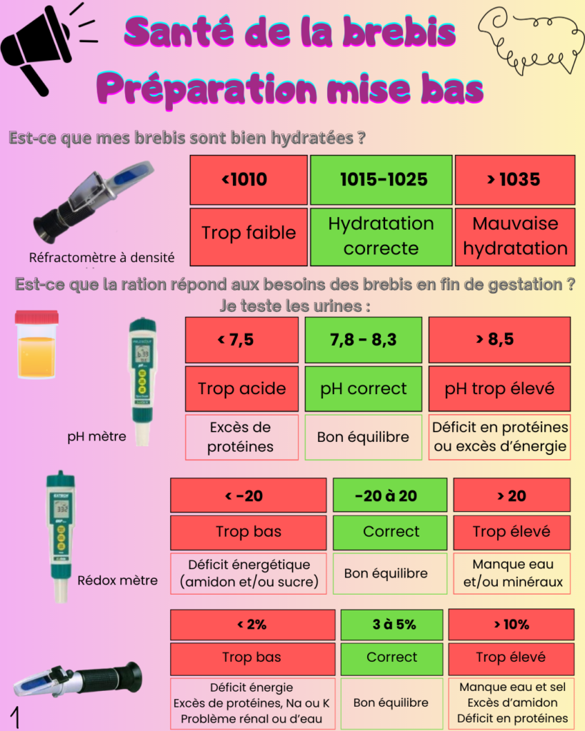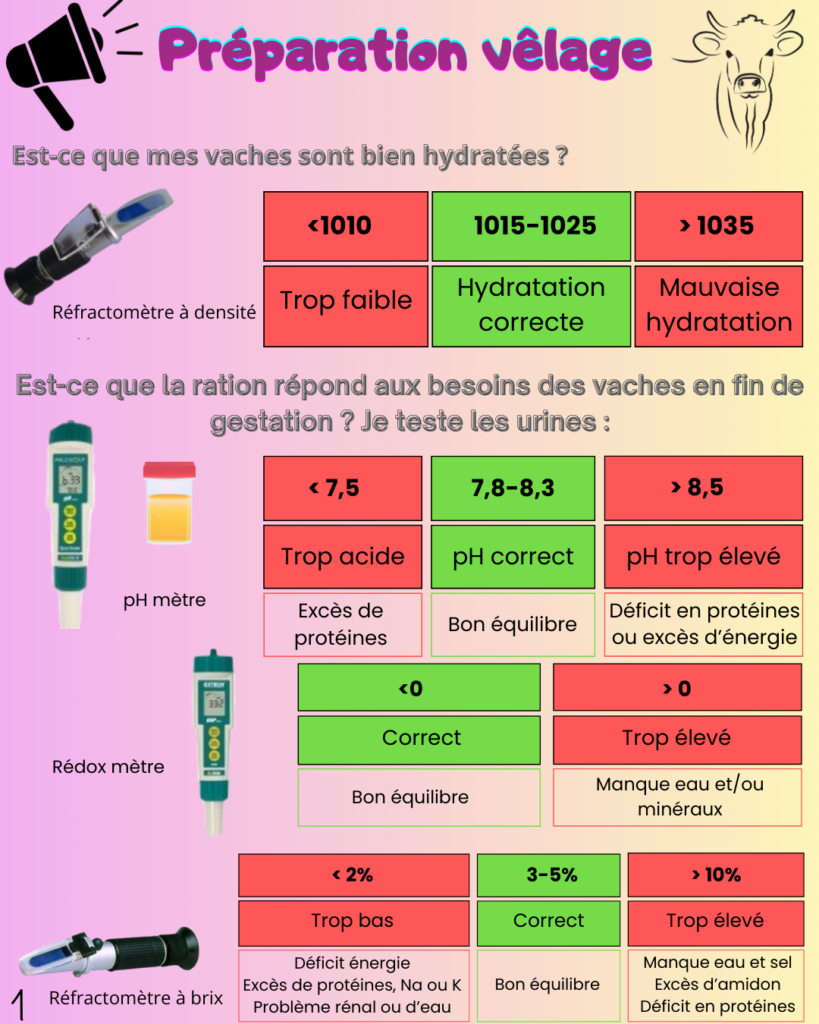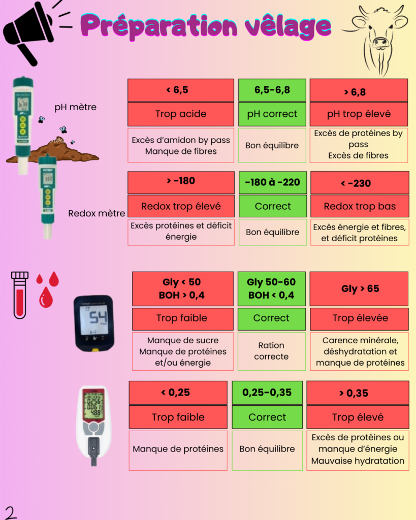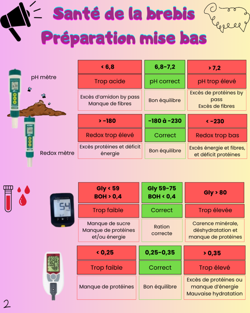 Le bon déroulement de la mise bas dépend aussi de la préparation : les 3 semaines avant terme durant lesquelles la mère arrive progressivement à sa ration de production pour laisser au rumen le temps de s’adapter et d’être pleinement efficace dès le début de lactation. Voici quelques mesures de valeurs afin de s’assurer du bon équilibre alimentaire et préparer au mieux la mise bas.