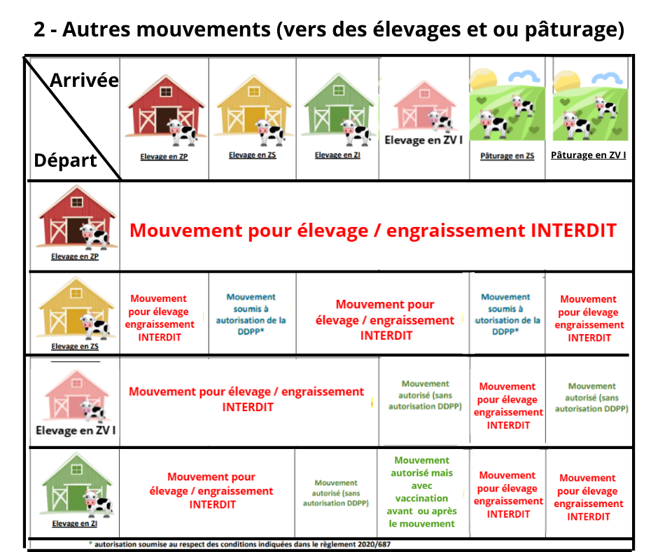 Tous les mouvements sont interdits (y compris à pied d’un pré à l’autre !). Une demande d’autorisation de déplacement de vos bovins doit être réalisée auprès de la DDETSPP. Ces demandes sont instruites et étudiées au cas par cas. A faire au moins 48h avant le mouvement. Visite vétérinaire dans les 48h précédent un mouvement d’élevage et dans les 72h précédent un mouvement vers abattoir attestée (à la charge de l’éleveur) pour l’ensemble de la zone réglementée (ZP ET ZS) + attestation transport.