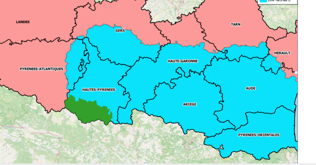Le zonage des 50 km autour du foyer impacte 26 communes des Hautes-Pyrénées qui sont placées en zone de surveillance.